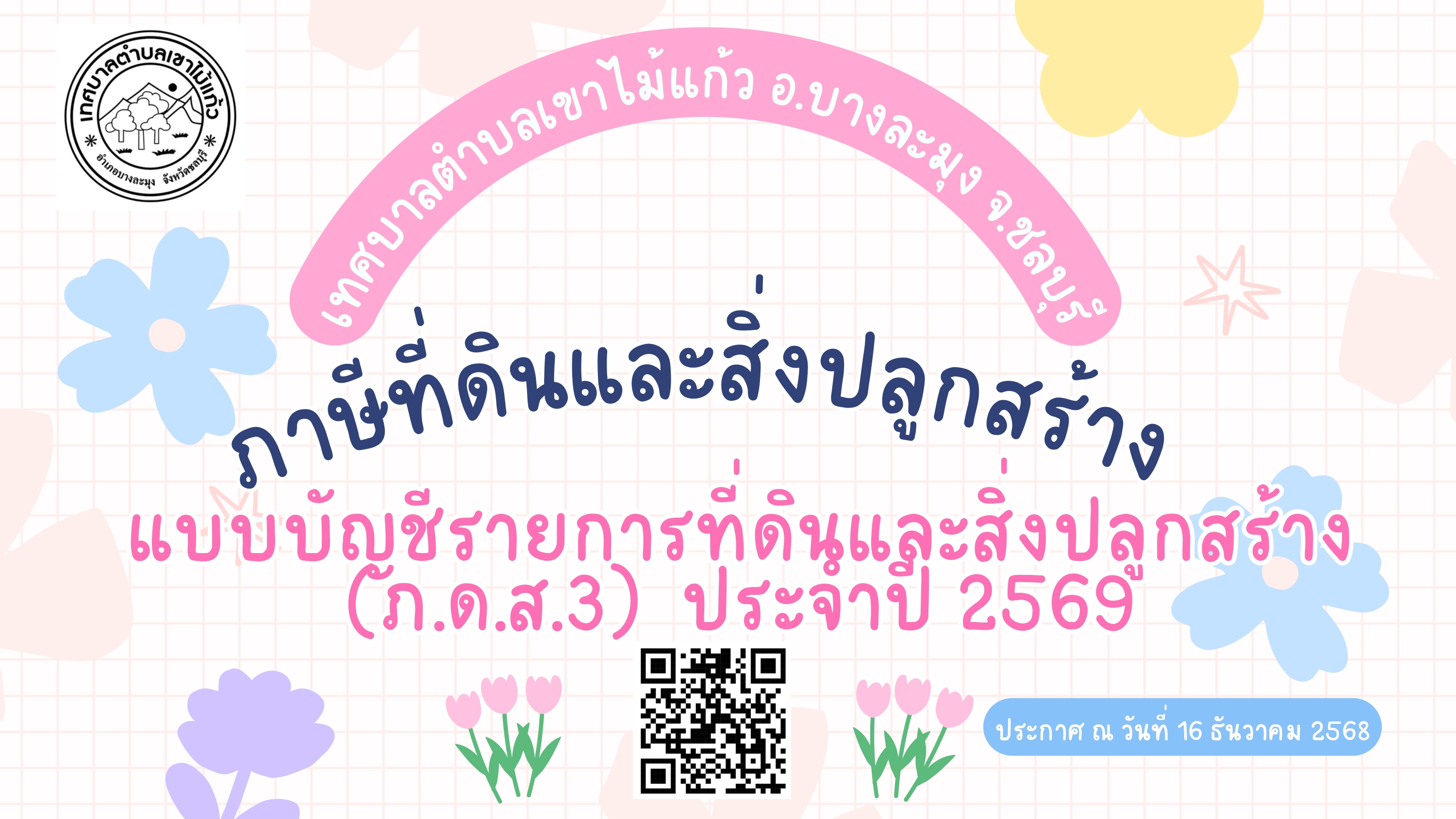 ประกาศเทศบาลตำบลเขาไม้แก้ว เรื่อง บัญชีรายการที่ดินและสิ่งปลูกสร้าง (ภ.ด.ส. 3) ประจำปี 2569